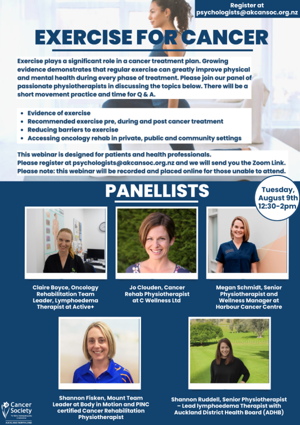 Please join The Cancer Society in an upcoming webinar on August 9th, 2022 at 12:30pm to discuss the role and benefits of exercise in cancer care. There will be a panel of experts to talk further on the topic, with room for Q&A.